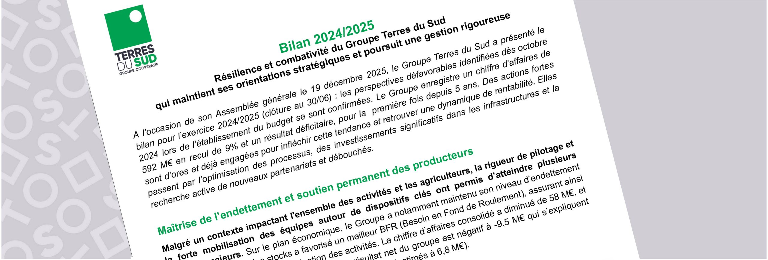 Résilience et combativité du Groupe Terres du Sud qui maintient ses orientations stratégiques et poursuit une gestion rigoureuse. A l’occasion de son Assemblée générale le 19 décembre 2025, le Groupe Terres du Sud a présenté le bilan pour l’exercice 2024/2025 (clôture au 30/06) : les perspectives défavorables identifiées dès octobre 2024 lors de l’établissement du budget se sont confirmées. Le Groupe enregistre un chiffre d'affaires de 592 M€ en recul de 9% et un résultat déficitaire, pour la première fois depuis 5 ans. Des actions fortes sont d’ores et déjà engagées pour infléchir cette tendance et retrouver une dynamique de rentabilité. Elles passent par l’optimisation des processus, des investissements significatifs dans les infrastructures et la recherche active de nouveaux partenariats et débouchés.