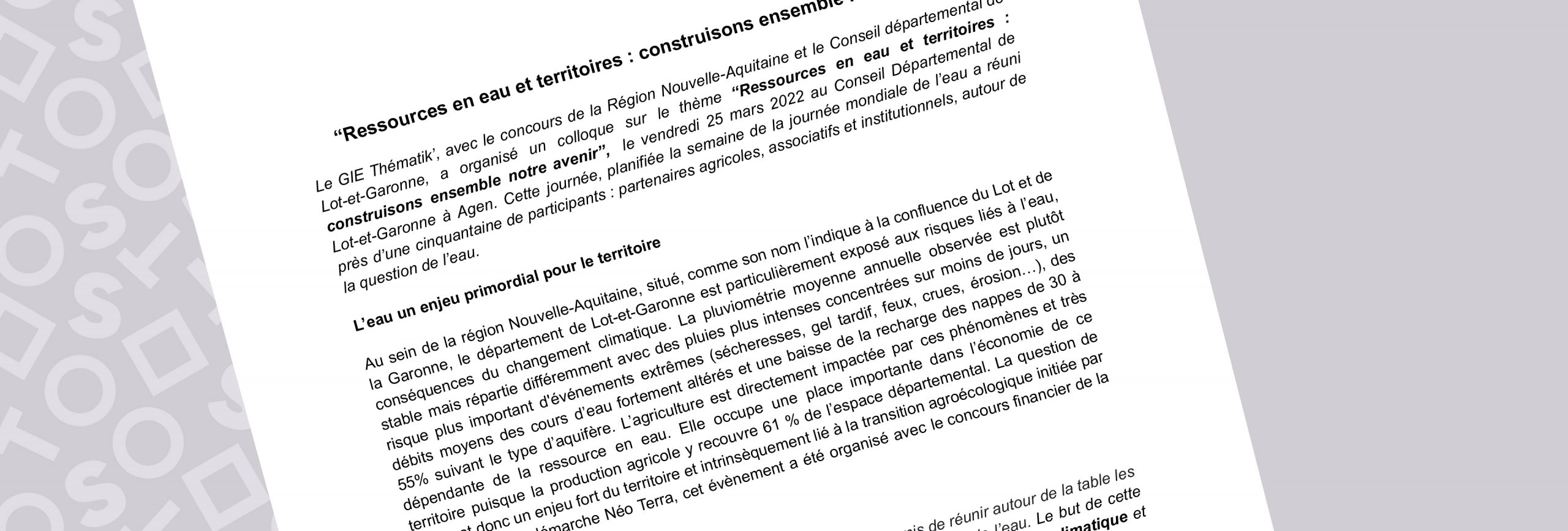 COMMUNIQUÉ DE PRESSE : Le GIE Thématik’, avec le concours de la Région Nouvelle-Aquitaine et le Conseil départemental de Lot-et-Garonne, a organisé un colloque sur le thème “Ressources en eau et territoires : construisons ensemble notre avenir”, le vendredi 25 mars 2022 au Conseil Départemental de Lot-et-Garonne à Agen. Le Groupe Terres du Sud fait partie des 21 membres du GIE Thématik.